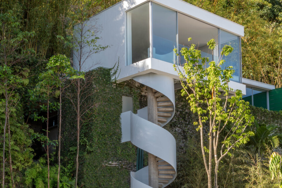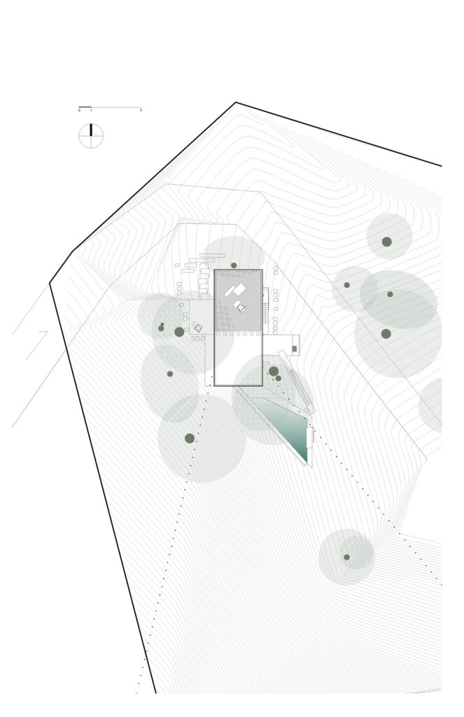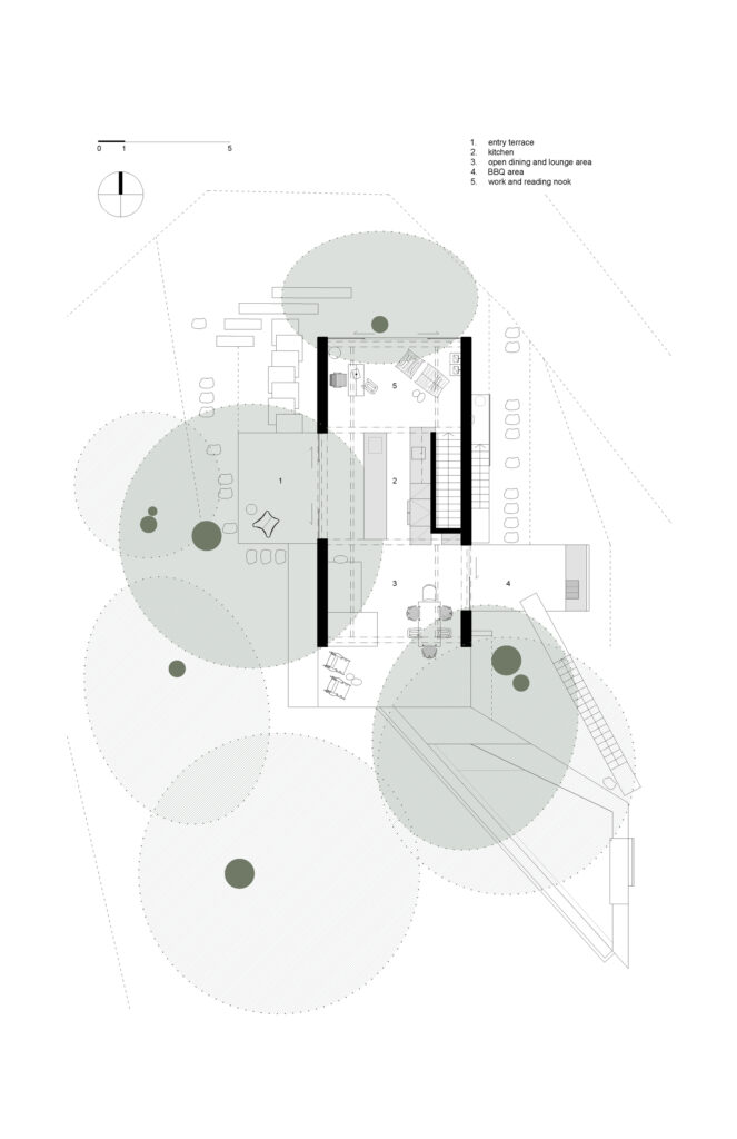 Na izlazu iz dnevnog boravka nalazi se terasa s roštiljem na razini tla, odakle COR-TEN čelične stepenice vode do trokutastog bazena koji se nadovezuje na prirodni pad – dinamična forma bazena vizualno se prenosi do krovne terase među krošnjama, idealne za promatranje zalaska sunca ili noćnog neba. Veći dio kuće ostaje skriven – privatni prostori prizemlja vidljivi su samo iz intimnijeg dijela vrtne zone.