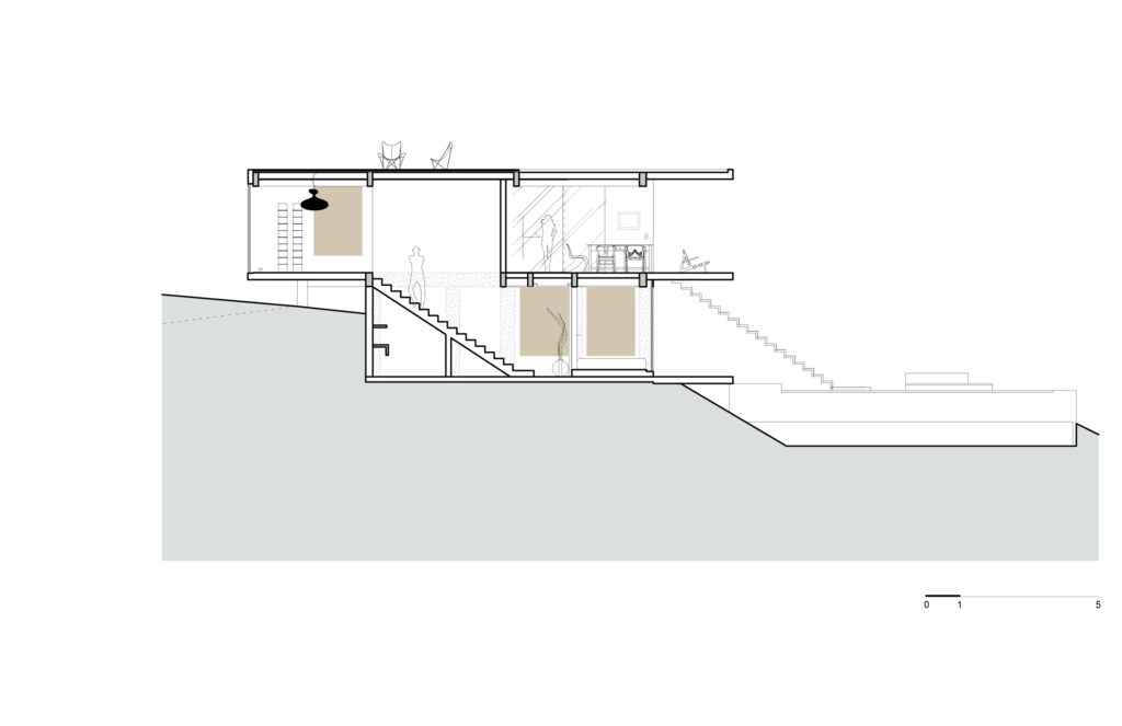 Gornja etaža obuhvaća prostrani dnevni boravak, djelomično natkriven, potpuno otvoren prema panorami. Prizemlje je povučeno u odnosu na gornji kat, prati konfiguraciju tla i sadrži spavaonice, kupaonicu i tehničke prostore. Vanjske i unutarnje stepenice, kao i staze od betonskih ploča, povezuju različite zone kuće i vrta.