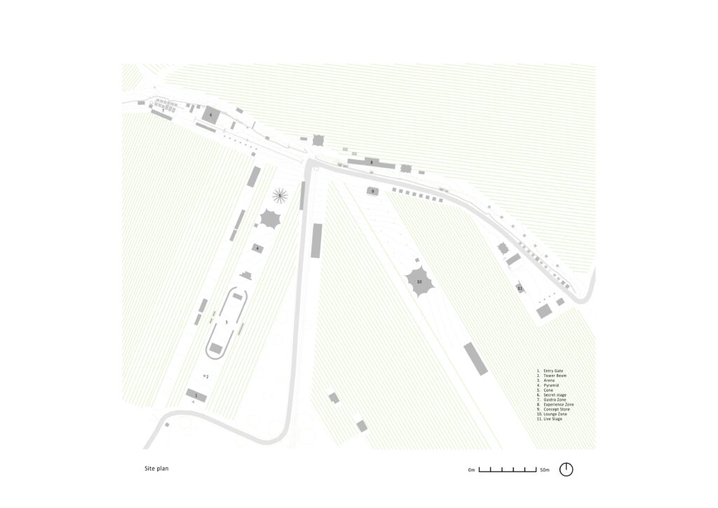Prostorna organizacija festivala temelji se na sustavu linearnih zona koje se konvergiraju u sjevernom centralnom čvoru, što omogućuje jasnu orijentaciju i prirodno kretanje posjetitelja kroz različite sadržaje. Ova logička sekvenca objekata prati ulaznu os, održavajući simetriju i funkcionalne veze između zona. Raspored zona izravno proizlazi iz topografije terasastih vinograda, čime arhitektura postaje produžetak krajolika, a ne njegova konkurencija.