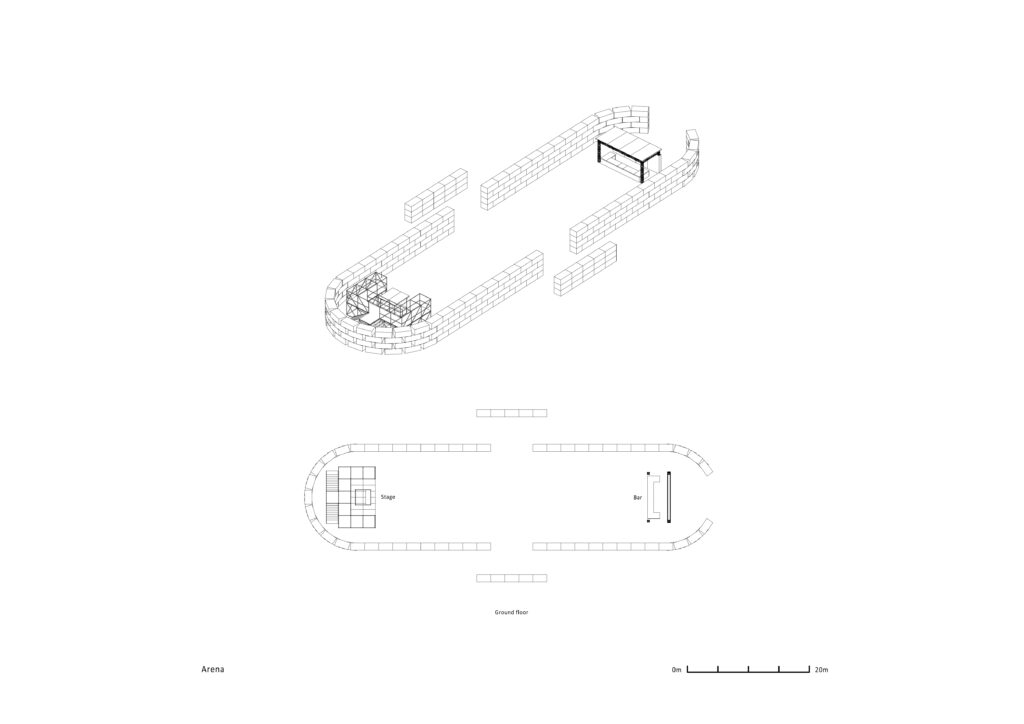 Projekt koristi materijale s niskim ekološkim otiskom i naglašava mogućnost ponovne upotrebe. Slamnate bale dominiraju u konstrukciji Arene, osiguravajući izvrsna akustička svojstva i lakoću montaže i demontaže.