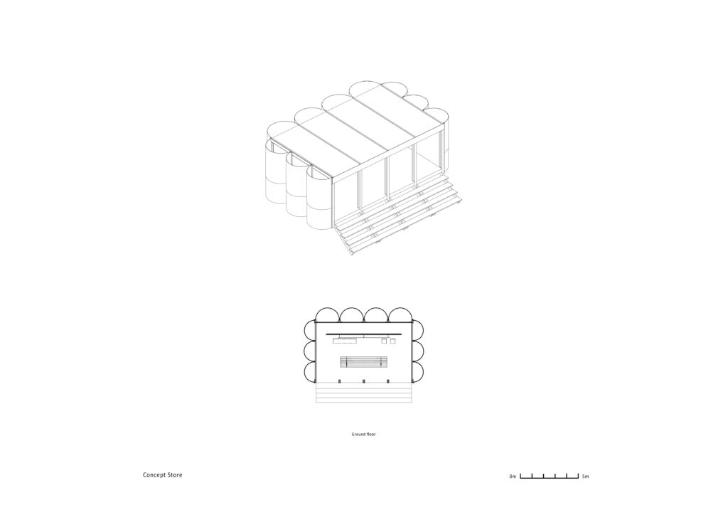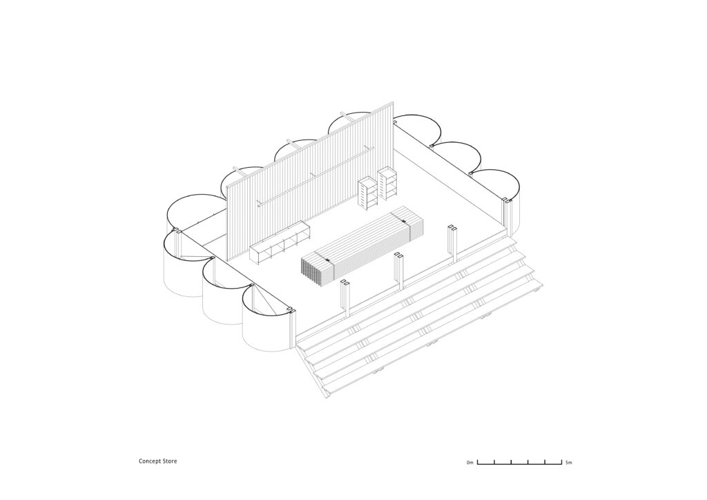 Concept Store funkcionira kao multifunkcionalna prodajna točka i prijelazna zona između ulaza i chillout zone. Otvorena južna fasada s tribinskim sjedenjem povezuje objekt s pejzažem, dok unutrašnjost naglašava ponovnu upotrebu materijala i jednostavnost konstrukcije.