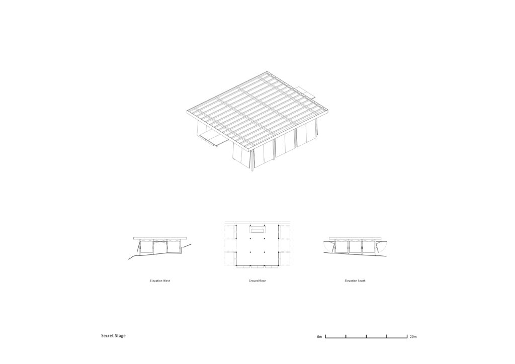 Secret Stage jedini je trajni objekt na lokaciji, budući da je grad izrazio želju da ga se zadrži kao turističku atrakciju. Zamišljen je kao varijabilna akustičko-vizualna školjka. Drvena konstrukcija s pivotirajućim panelima omogućuje otvaranje prema krajoliku danju, dok se noću zatvara u intiman klupski prostor. Polikarbonatna fasada difuzno raspršuje svjetlost, stvarajući jedinstvenu atmosferu.