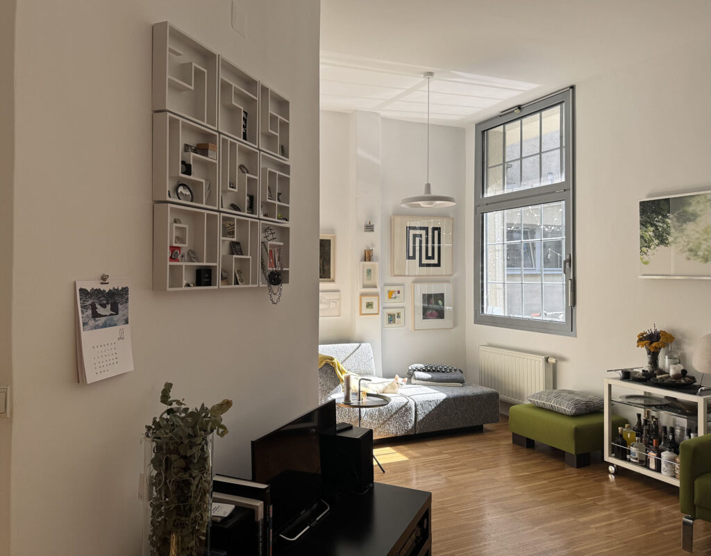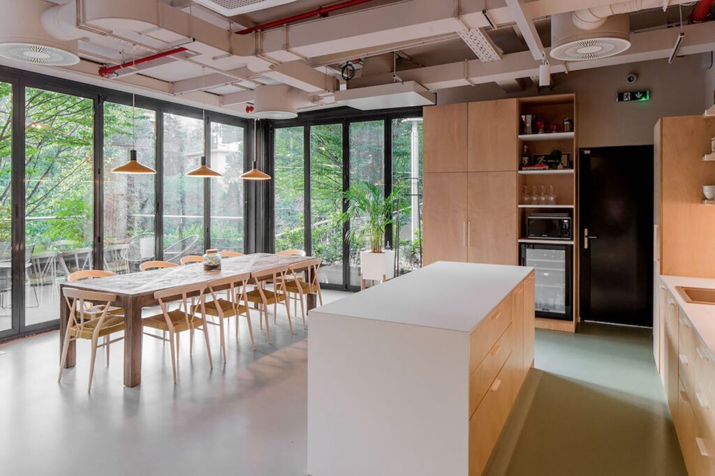 Uredi su oblikovani kao multifunkcionalan prostor koji objedinjuje izložbeni dio, radni prostor i terasu. Skrivena vrata diskretno razdvajaju izložbeni od uredskog dijela, dok staklena stijena otvara prostor prema zelenilu terase, uključujući ga u interijer. Radni prostor, uz radne stanice, čini velika biblioteka s uzorcima, literaturom i pločama za proces dizajna. Linearna organizacija završava kuhinjom i blagovaonicom povezanom s terasom, koja funkcionira i kao ljetna blagovaonica i vrt za uzgoj povrća i začina. Prostor oplemenjuju dizajnerski klasici Bernarda Bernardija, Nike Kralja i Meblo svjetiljke iz 1970-ih. Izložbeni dio uključuje hommage tom razdoblju, u potpunosti oblikovan u duhu jugoslavenskog dizajna 1970-ih.