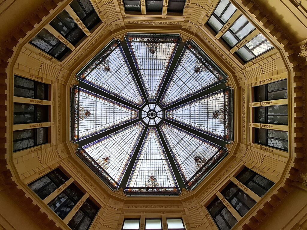 Monumentalna zgrada u središtu Zagreba projektirana je kao cjelina sa susjednom Eskomptnom bankom u Ilici 3, djelom arhitekata Fellera & Helmera. Oni su postavili idejnu osnovu za palaču Prve hrvatske štedionice, a razradu projekta izveo je Josip Vancaš, uvevši prvi zagrebački pasaž – trgovačku galeriju s inovativnim inženjerskim rješenjima. Simbol zgrade postala je ostakljena kupola nad središnjim oktogonom, po kojoj nosi nadimak Oktogon. Bogata dekoracija s alegorijskim figurama Dragutina Moraka te reljefima Reinhardta Völkla ističe motive blagostanja, štedljivosti, trgovine i industrije. Vrata pasaža izrađena su u Obrtnoj školi. Izvorna neostilska ornamentika pročelja pojednostavljena je 1925. prema zamisli Lava Kalde, a spoj secesije, neorenesanse i neobaroka čini zgradu vrhunskim ostvarenjem prijelaza 19./20. stoljeća. Nekadašnji bankarski prostori prenamjenjuju se u galerijsko-muzejski prostor Nacionalnog muzeja moderne umjetnosti.