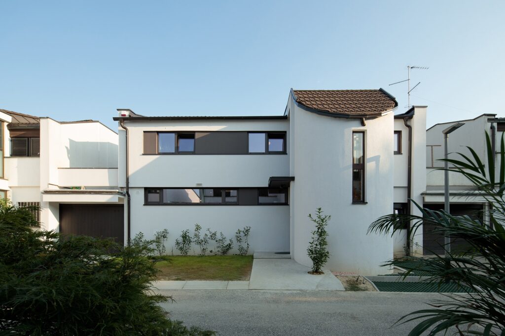 Prostornu koncepciju kuće određuju nagibi terena i vizure na grad, a unutrašnjost je organizirana po vertikali. Dva volumena povezana su zatvorenim hodnikom u prizemlju i na najnižoj etaži. Manji volumen sadrži garažu, gostinjski apartman i prostore za okupljanja, dok je u većem smješten stan vlasnika. Tlocrt s tri ulaza čini glavnu odrednicu – glavni na razini ceste, sporedni prema „djevojačkom“ apartmanu te bočni prema gostinskom. Dnevni boravak prostire se na dvije razine: gornju sa salonom i pogledom na grad te donju s izlazom u vrt. Dramatičan izraz nastaje kontrastom linija ceste i volumena, dok fasade urezuju monolitnu masu. Balkon, pergola i niše naglašavaju pročelje, a klinker pločice različitih debljina stvaraju treperav mozaik kuće.