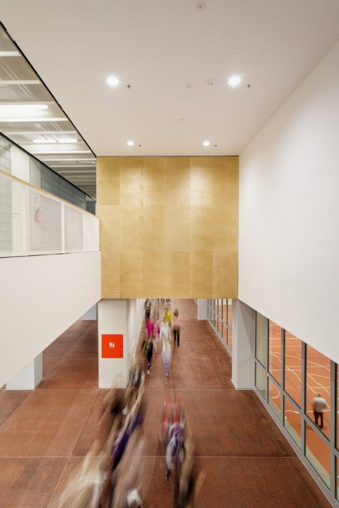 Zgrada XII. gimnazije u Gornjoj Dubravi rezultat je dugogodišnjih nastojanja škole, lokalne zajednice i Grada Zagreba da se omoguće suvremeni uvjeti rada. Nakon arhitektonsko-urbanističkog natječaja iz 2013./2014., s programom gimnazije i klizačke dvorane, zbog ograničenja zelene površine primijenjena je vertikalna dispozicija – nastavni sadržaji smješteni su na katu iznad prizemnih prostora namijenjenih i široj zajednici. Takvo rješenje omogućuje paralelno odvijanje aktivnosti bez ometanja nastave. Čelična konstrukcija velikih raspona i sustav rešetki visine jedne etaže omogućili su postavu učionica na katu, a suhomontažna logika gradnje definirala je izbor materijala. Krajnji rezultat oblikovno i karakterom upućuje na industrijsku arhitekturu, ističući funkcionalnost i racionalnost.