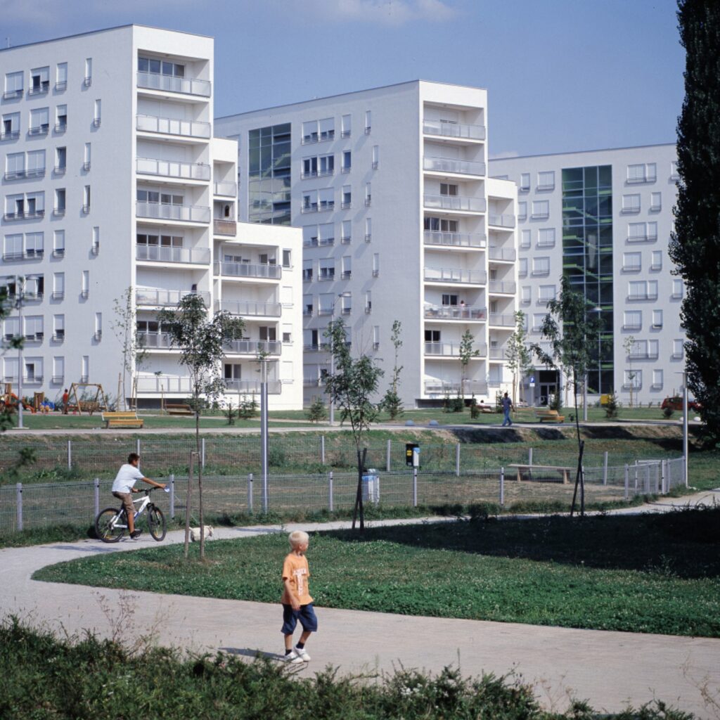 Atrijske kuće u Sigetu, izgrađene 1970., rijedak su primjer „tepih“ tipologije u Hrvatskoj, organizirane u nizove s introvertiranim pročeljima prema ulici i otvorenošću prema privatnim atrijima. Smještene u mirne kolno-pješačke zone, nude kombinaciju privatnosti, funkcionalnosti i kontakta s vanjskim prostorom, ostajući primjer kvalitetnog niskog stanovanja u Novom Zagrebu. Kuće su se od 1990-ih postupno nadograđivale prema izvornom predlošku autorice. Jedna od njih rekonstruirana je i prilagođena suvremenim potrebama – prizemlje je namijenjeno peteročlanoj obitelji, a kat arhitektonskom studiju, uz jasno odvojene vanjske prostore: intimno obiteljsko dvorište i zasebnu terasu za ured. Rekonstrukcija je zahtijevala promišljeno oblikovanje radi očuvanja privatnosti i omogućavanja rada, uz minimalne izmjene eksterijera i značajne unutarnje preinake kako bi prostor zadovoljio dvojnim funkcijama te naglasio vrijednosti izvorne arhitekture.