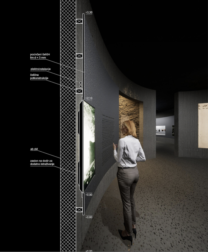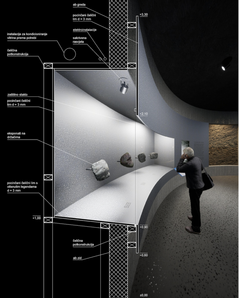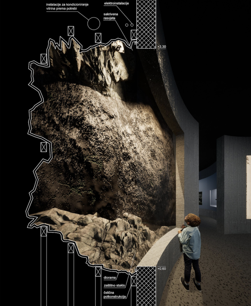 Nizanje prostornih sekvenci, fluidnih, jasno i prostorno programskih povezanih prostora apstrahiranih kaverni, izmjena neočekivanih ambijenata i povremenog prodora prirodnog svjetla glavne su odlike karaktera ovog prostora. S jedne strane kretanje posjetitelja doima se poput neplanirane i neočekivane putanje unutar prirodne tvorevine, s druge strane tečno je, jasno usmjereno i nedvojbeno poput klasične kontinuirane galerijske enfilade. Koncept izložbenog postava primarno je postavljen kao edukativno mjesto, reducirane i pročišćene vizualne komunikacije, naglašeno ambijentalno, s fokusom na artefakte, bilo da je riječ o originalima, replikama ili rekonstrukcijama”, između ostalog opisuju autori.
